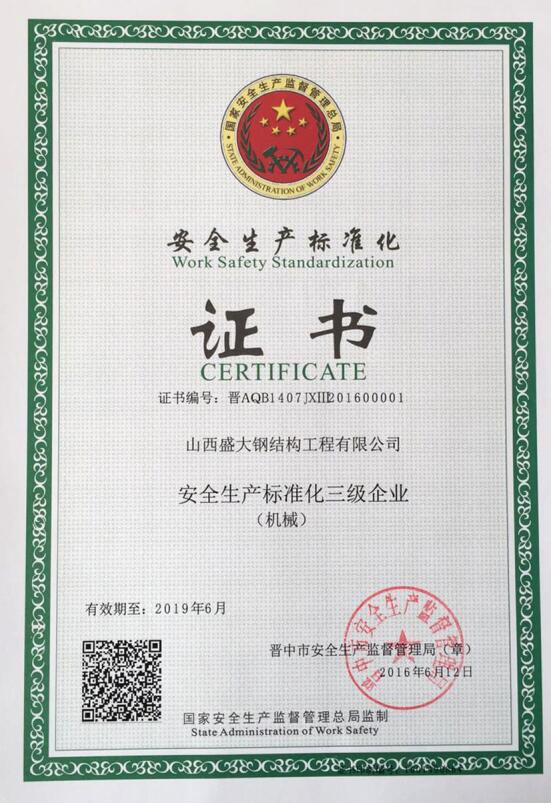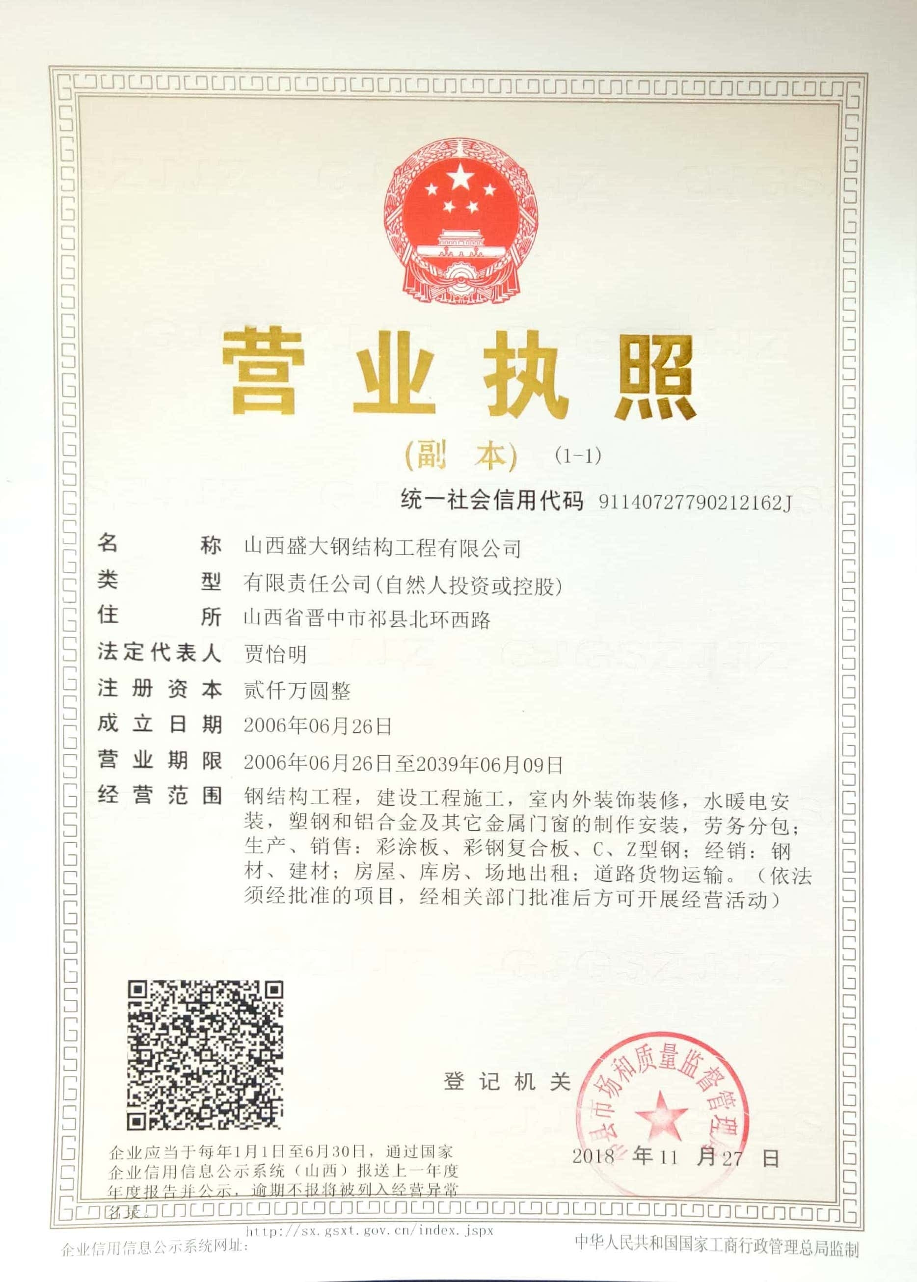 山西盛大鋼結(jié)構(gòu)工程有限公司 山西盛大鋼結(jié)構(gòu)工程有限公司成立于1996年,坐落于國家歷史文化名城——山西祁縣。擁有兩大智能化鋼結(jié)構(gòu)生產(chǎn)基地,占地110畝,建筑面積3萬余平方米,具備鋼結(jié)構(gòu)專業(yè)承包貳級、建筑工程施工總承包貳級資質(zhì),是一家集設(shè)計(jì)、制造、施工于一體的大型鋼結(jié)構(gòu)工程企業(yè)。 盛大鋼構(gòu)是中國鋼結(jié)構(gòu)協(xié)會會員單位,山西鋼結(jié)構(gòu)協(xié)會副會長單位,山西建筑企業(yè)商會理事單位,山西省土木建筑學(xué)會會員單位,擁有國家知識產(chǎn)權(quán)局注冊商標(biāo)。公司已通過ISO9001質(zhì)量管理體系認(rèn)證,體系覆蓋鋼結(jié)構(gòu)加工與施工等核心… more +